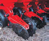 Сеялка имеет мощные колтеры и широкие диски. Колтеры хорошо разрезают пожнивные остатки колосовых культур и подсолнечника. Если почва с комками, колтер легко их крошит и дает возможность сошнику вложить семя на заданную глубину. Колтер изготовлен с тангенциальным профилем изгиба и при работе на переувлажненных почвах может самоочищаться.